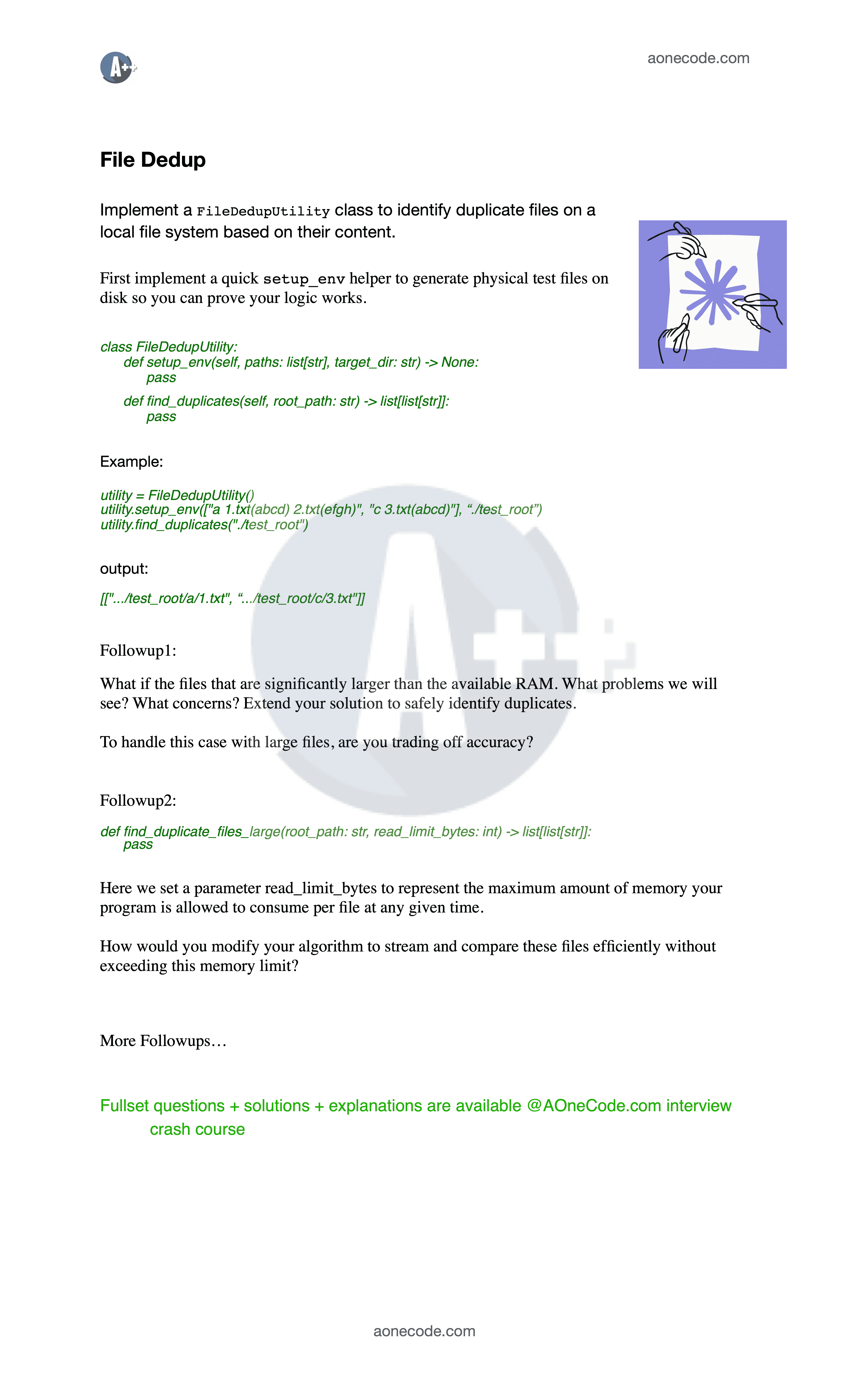 Most recent interview questions and system design topics gathered from aonecode alumnus.