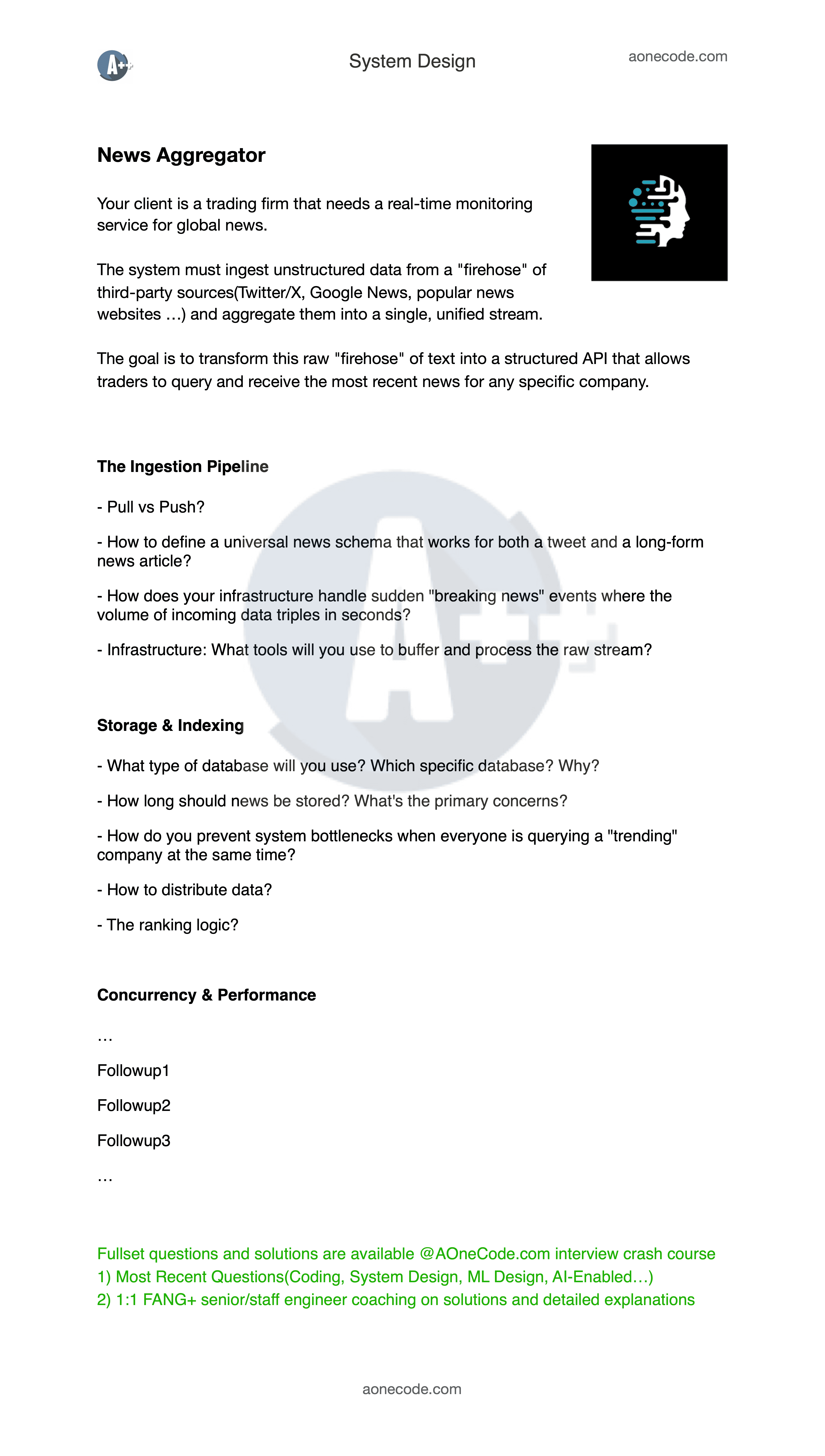 The system must ingest unstructured data from a "firehose" of third-party sources(Twitter/X, Google News, popular news websites …) and aggregate them into a single, unified stream.